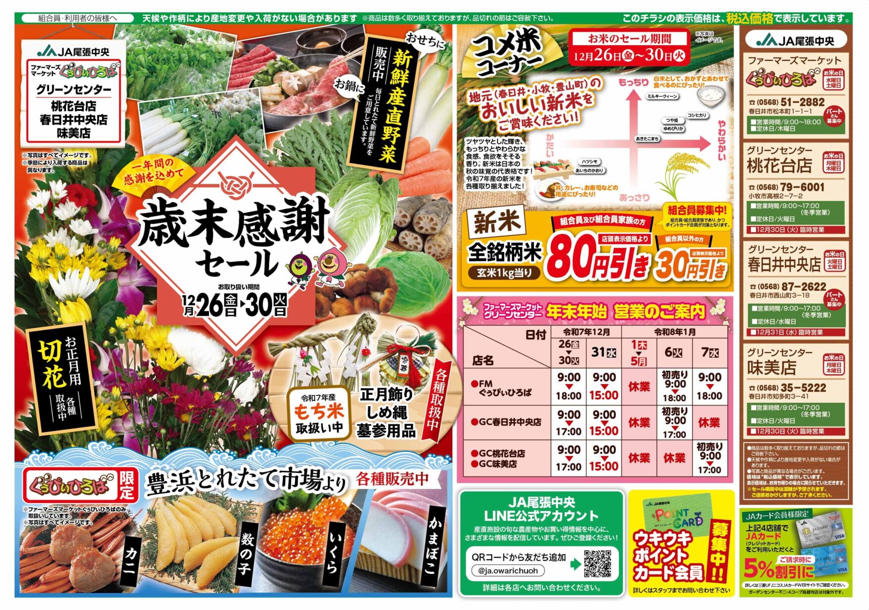 各産直施設では、26日(金)~30日(火)までの5日間、日頃の感謝を込めて「年末感謝セール」を開催いたします。