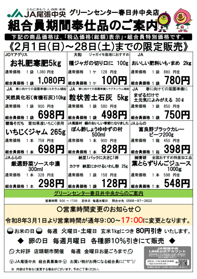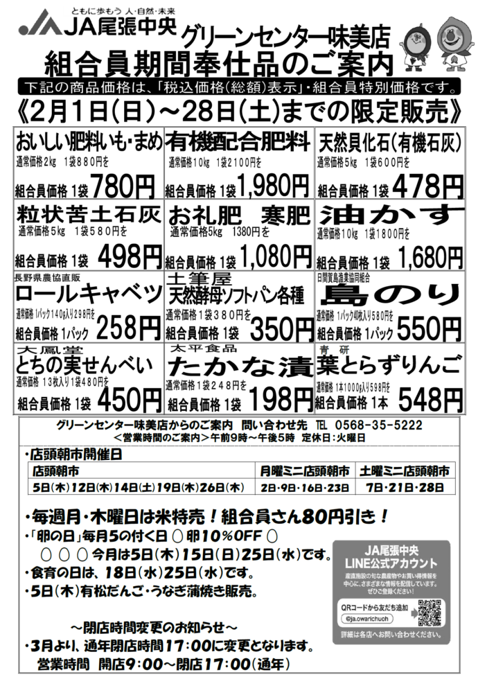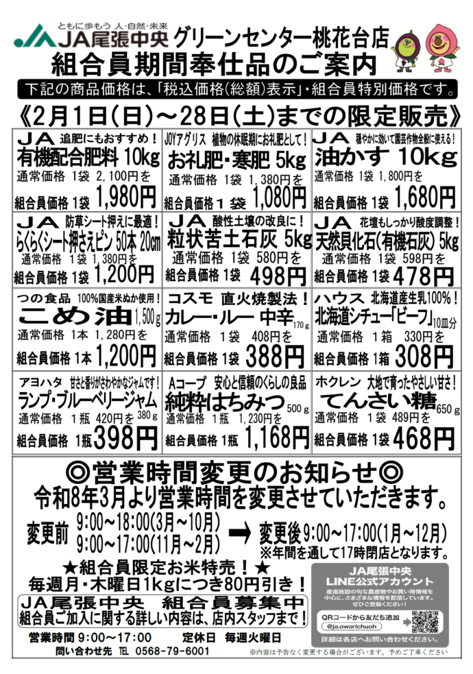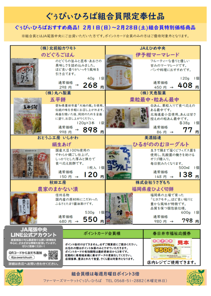 各産直施設では組合員の方限定で、一部の商品がお買い求めやすい値段となる「組合員特別奉仕品」の販売を行っております。