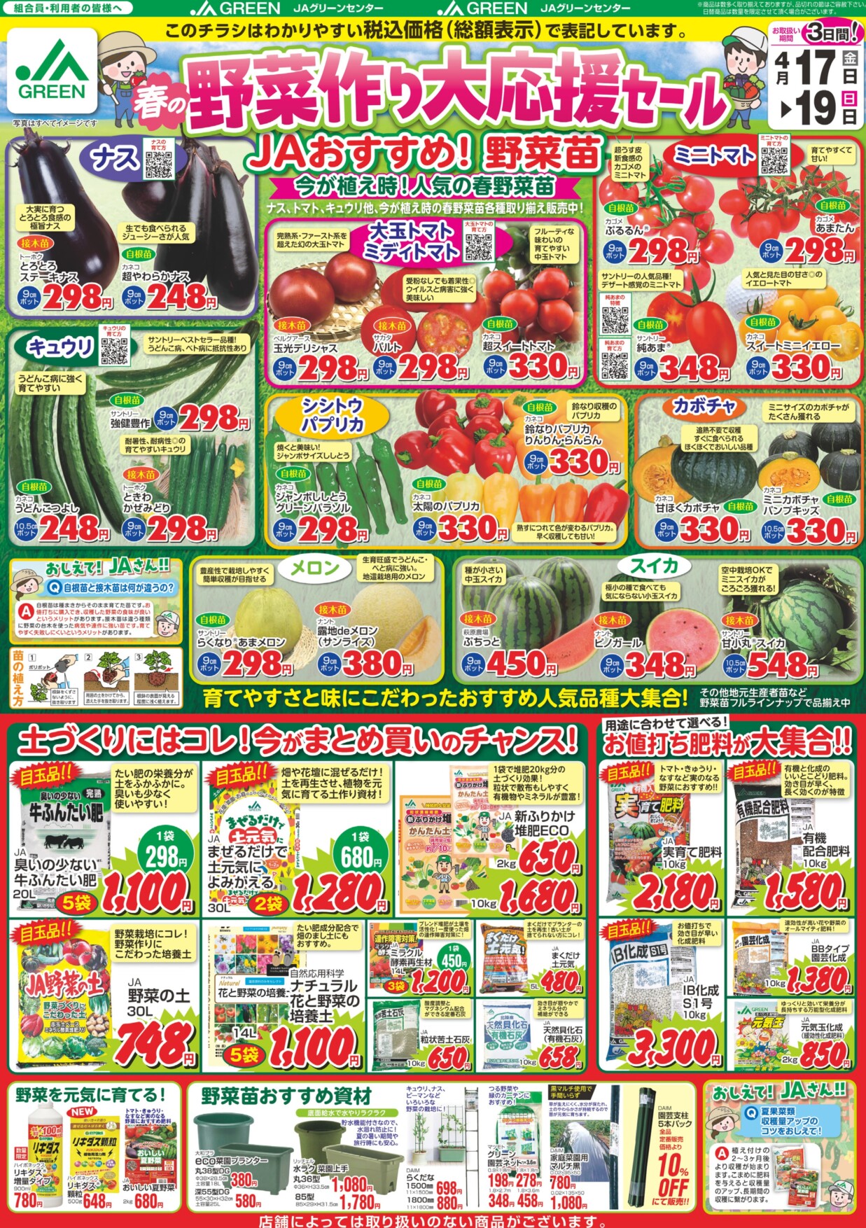 今が植え時の人気の春野菜苗が特別価格で販売されます。肥料や花苗もお値打ちにお買い求めいただけます。