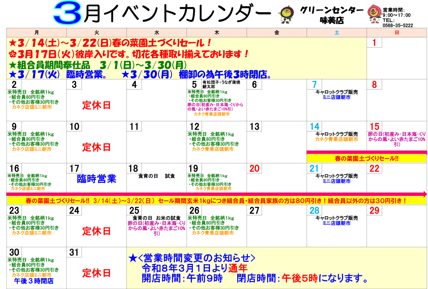 🕘 9:00~17:00(水曜定休) 🌾 お米の日:火・土 開く ▼