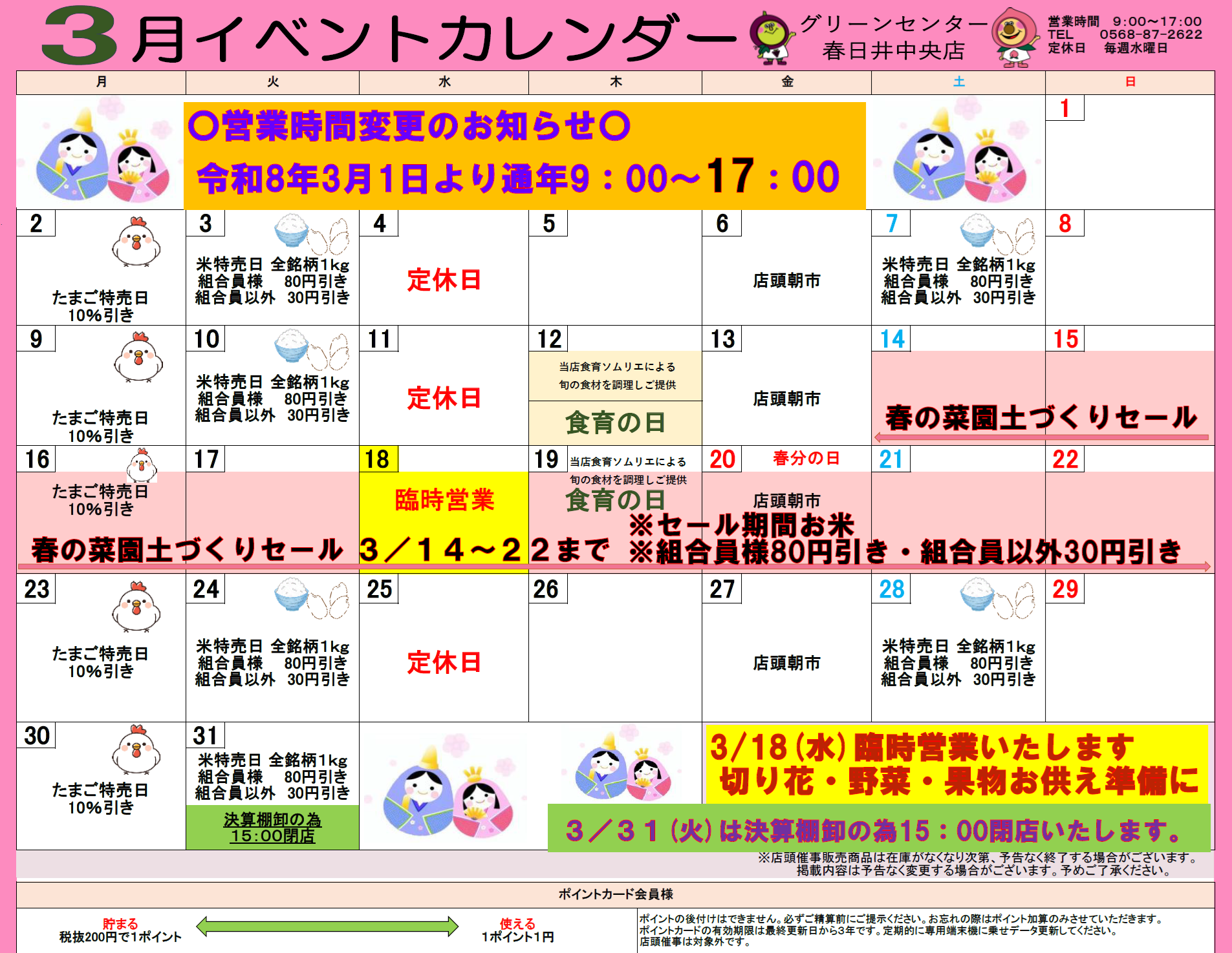 現在、冬季営業時間として17時閉店としておりますが、3月以降につきましても通年で 17時閉店 となります。