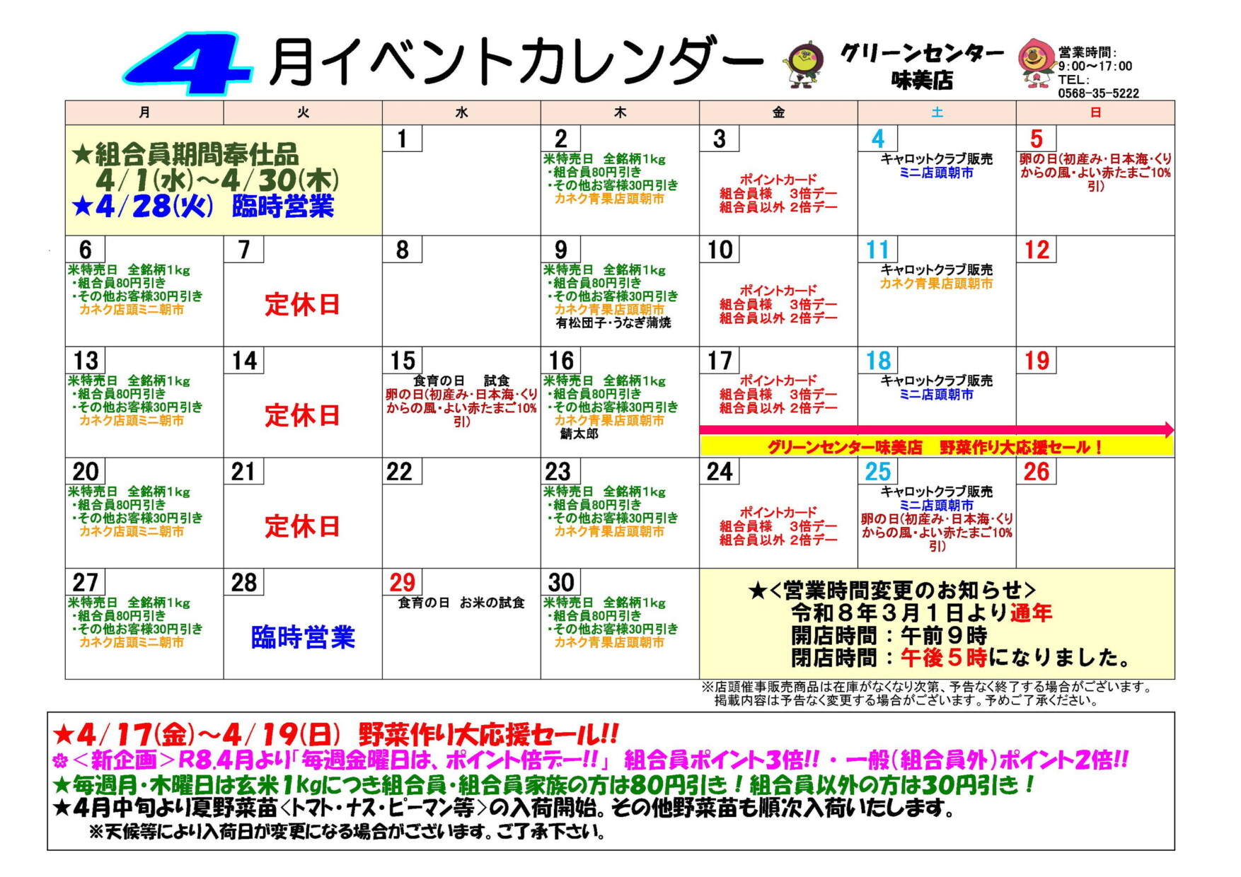 🕘 9:00~17:00(火曜定休) 🌾 お米の日:月・木 開く ▼