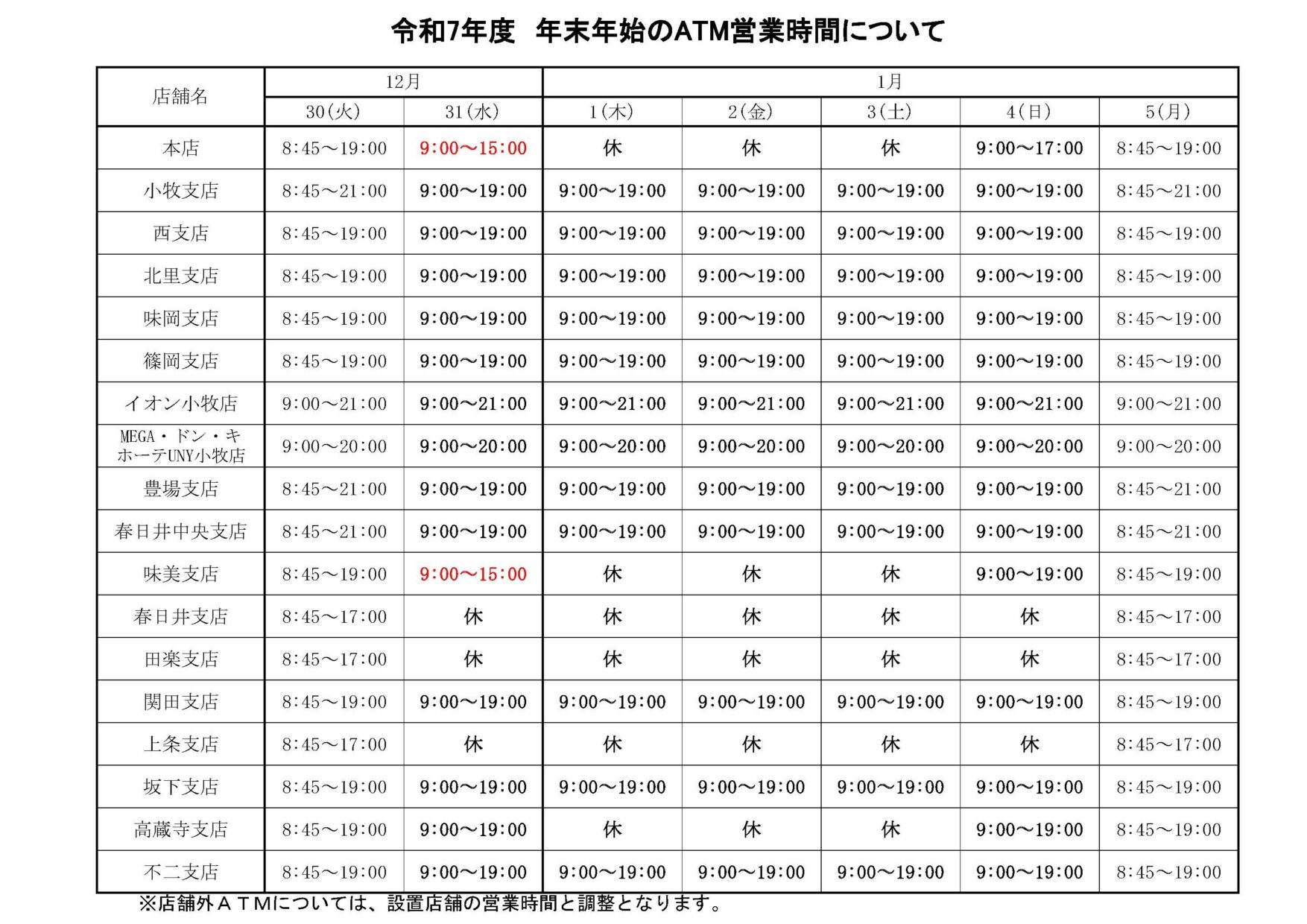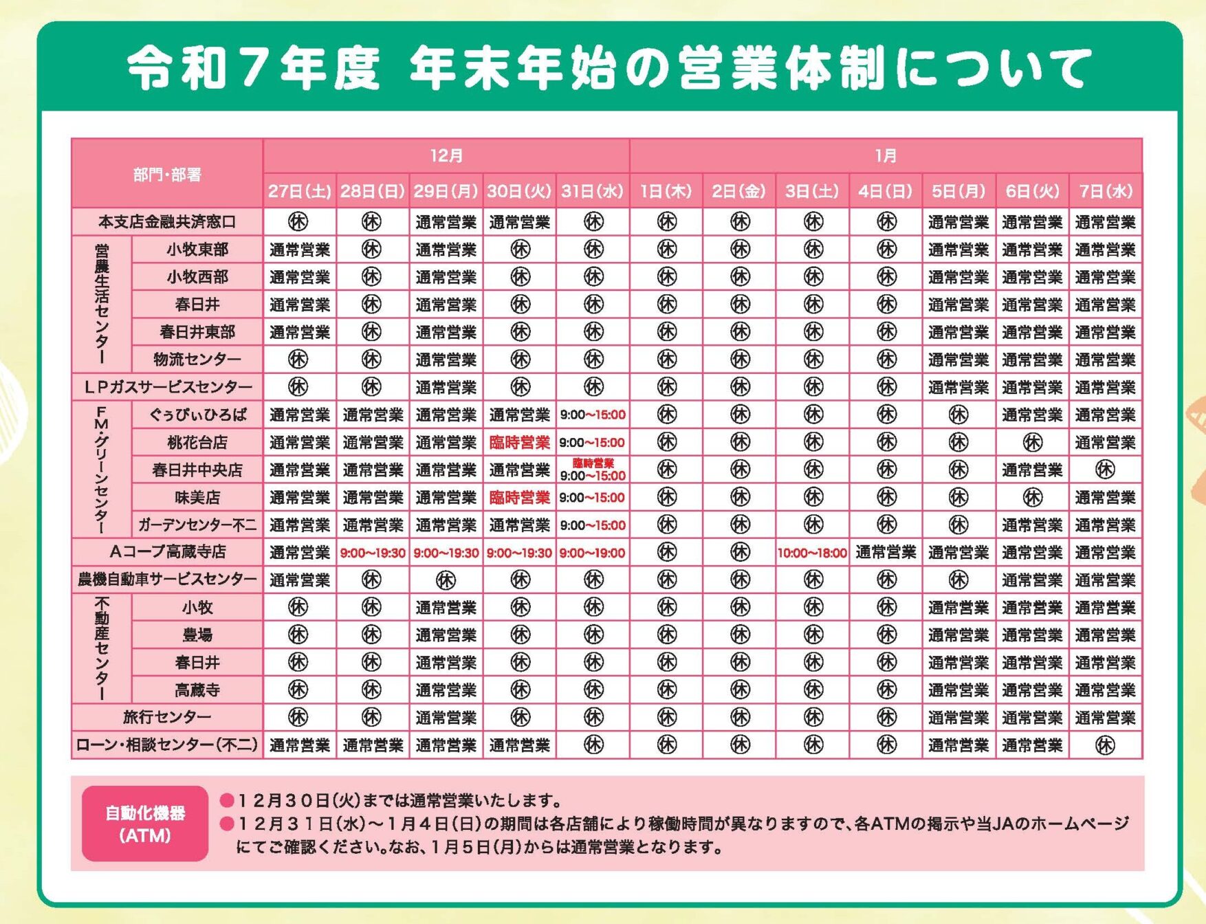 平素は当JAをご利用いただき、誠にありがとうございます。 令和7年度の年末年始における、支店・各事業所の営業体制およびATMの稼働状況をご案内いたします。
