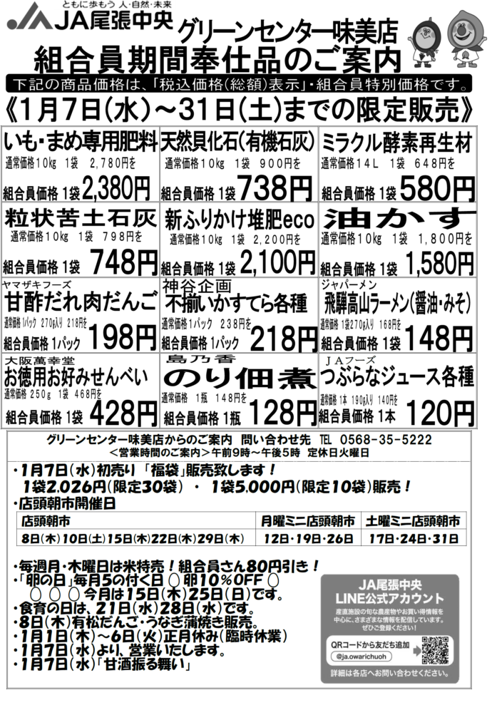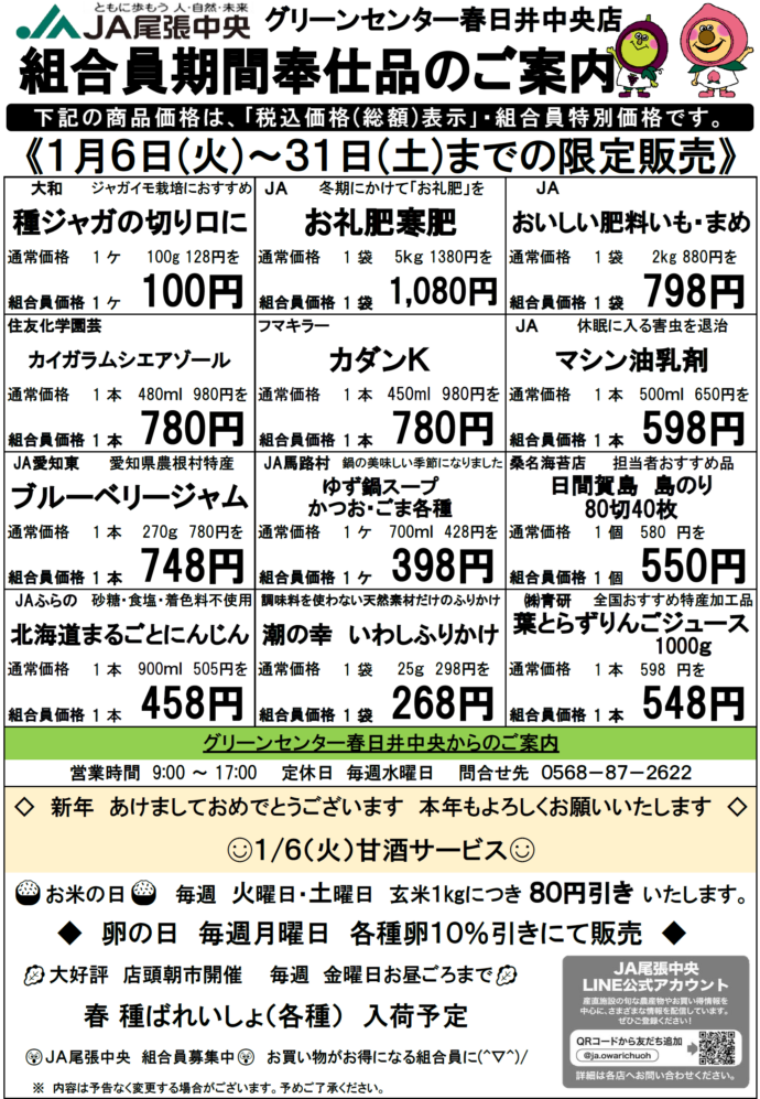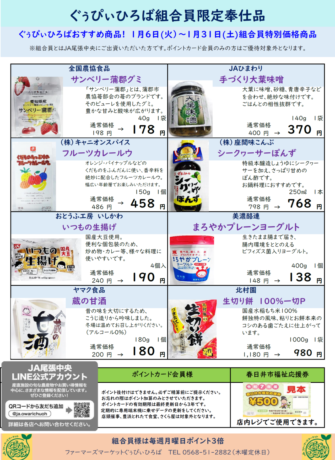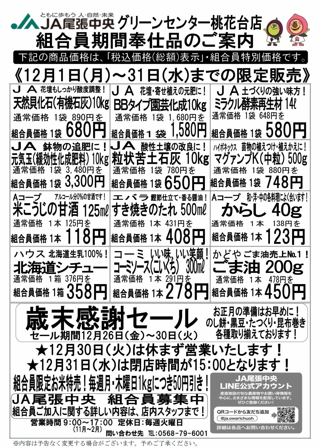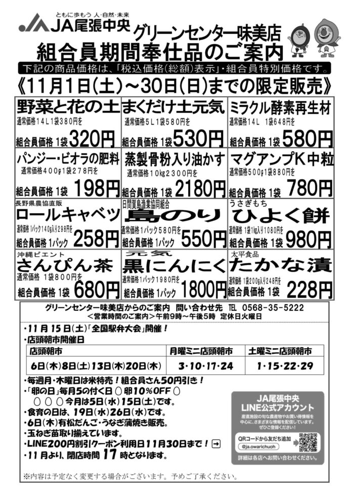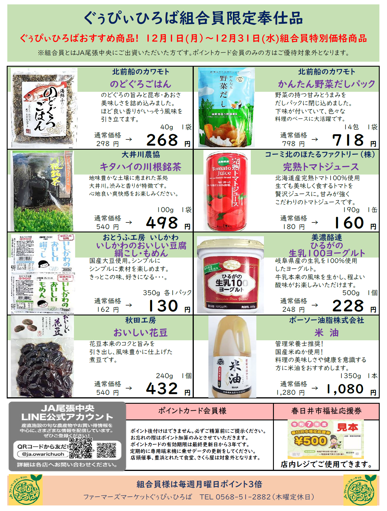 各産直施設では組合員の方限定で、一部の商品がお買い求めやすい値段となる「組合員特別奉仕品」の販売を行っております。