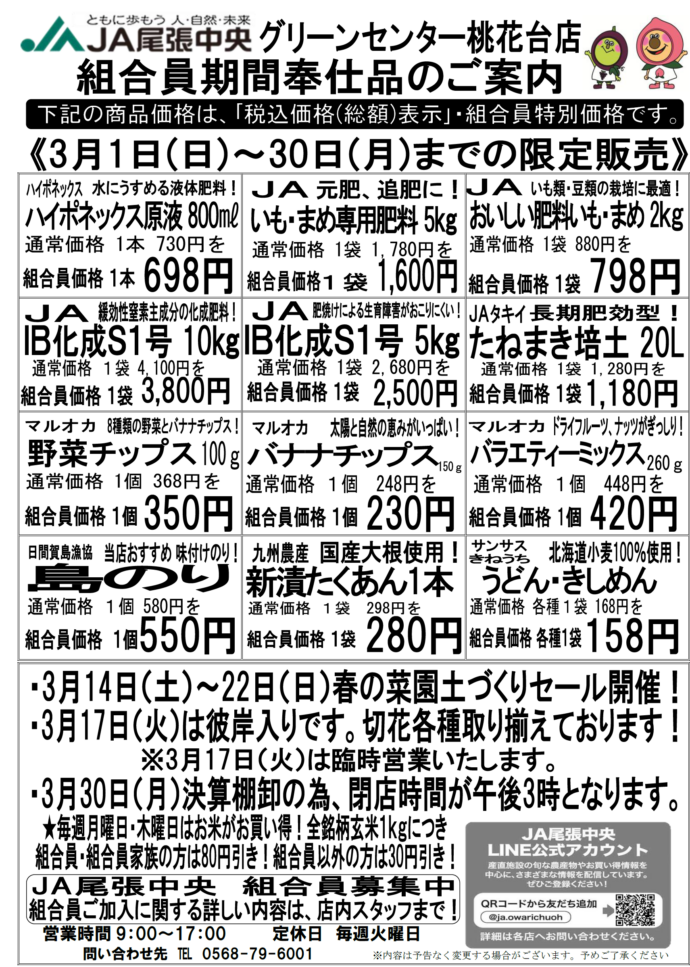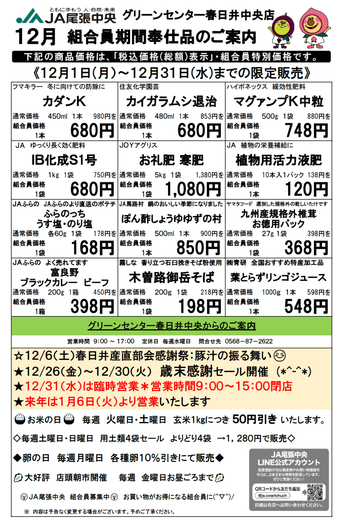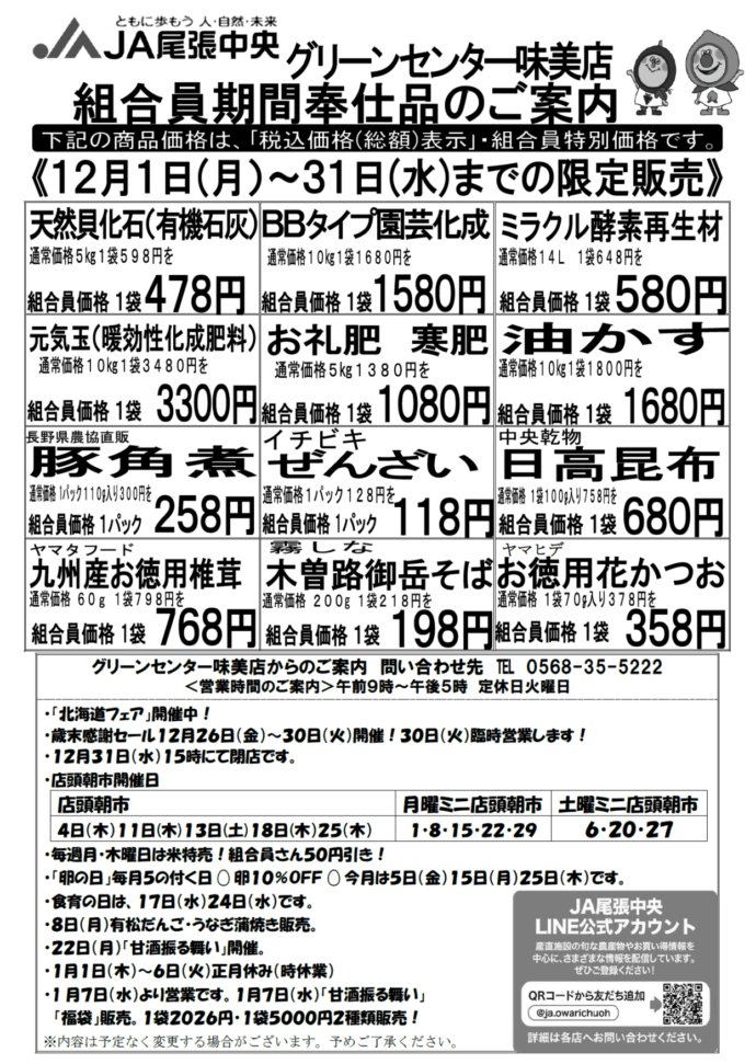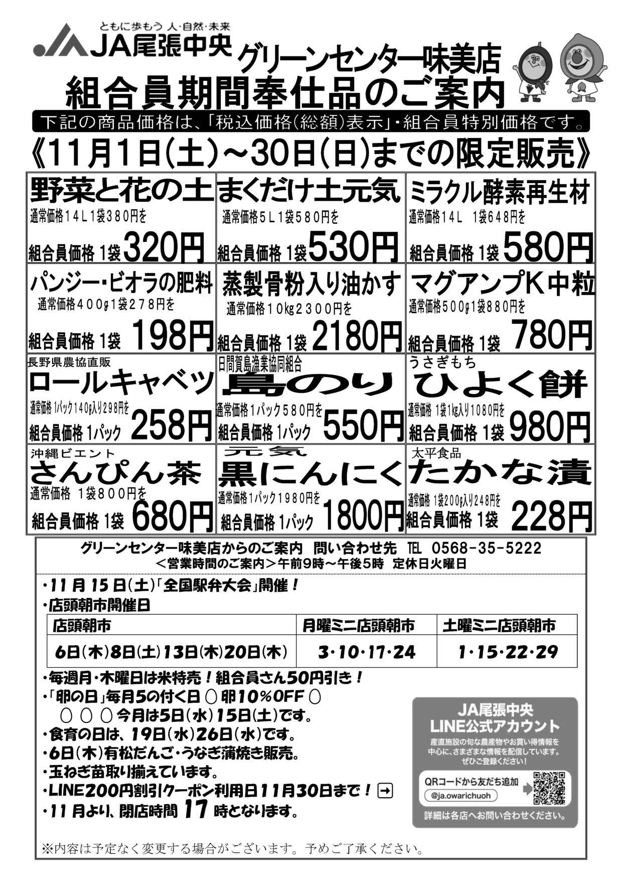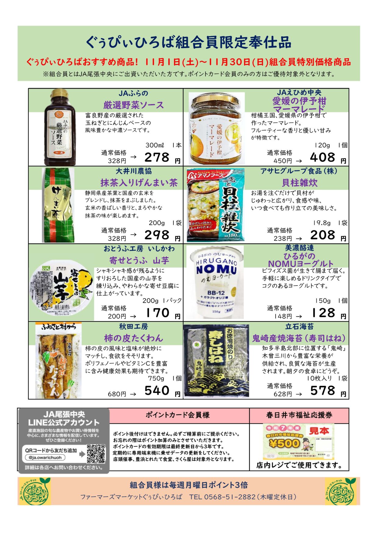 各産直施設では組合員の方限定で、一部の商品がお買い求めやすい値段となる「組合員特別奉仕品」の販売を行っております。