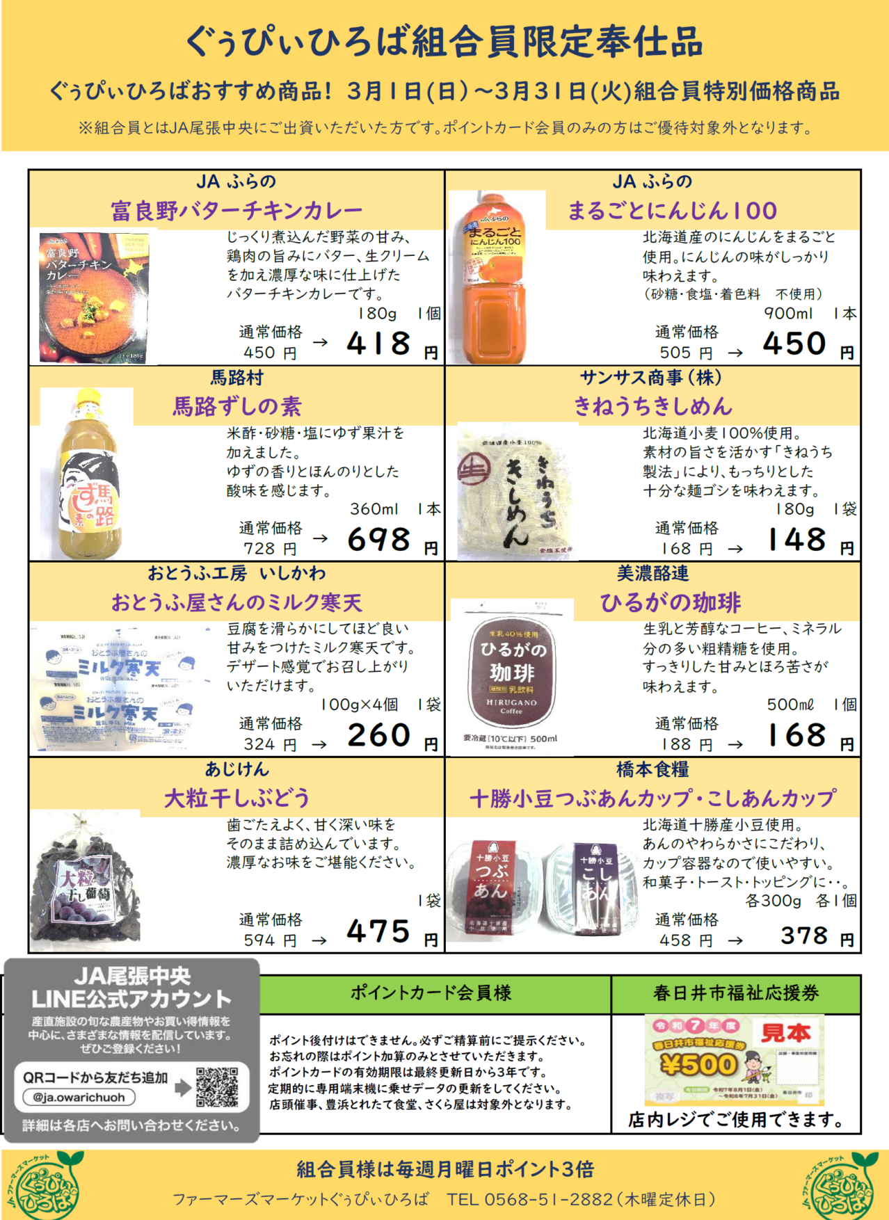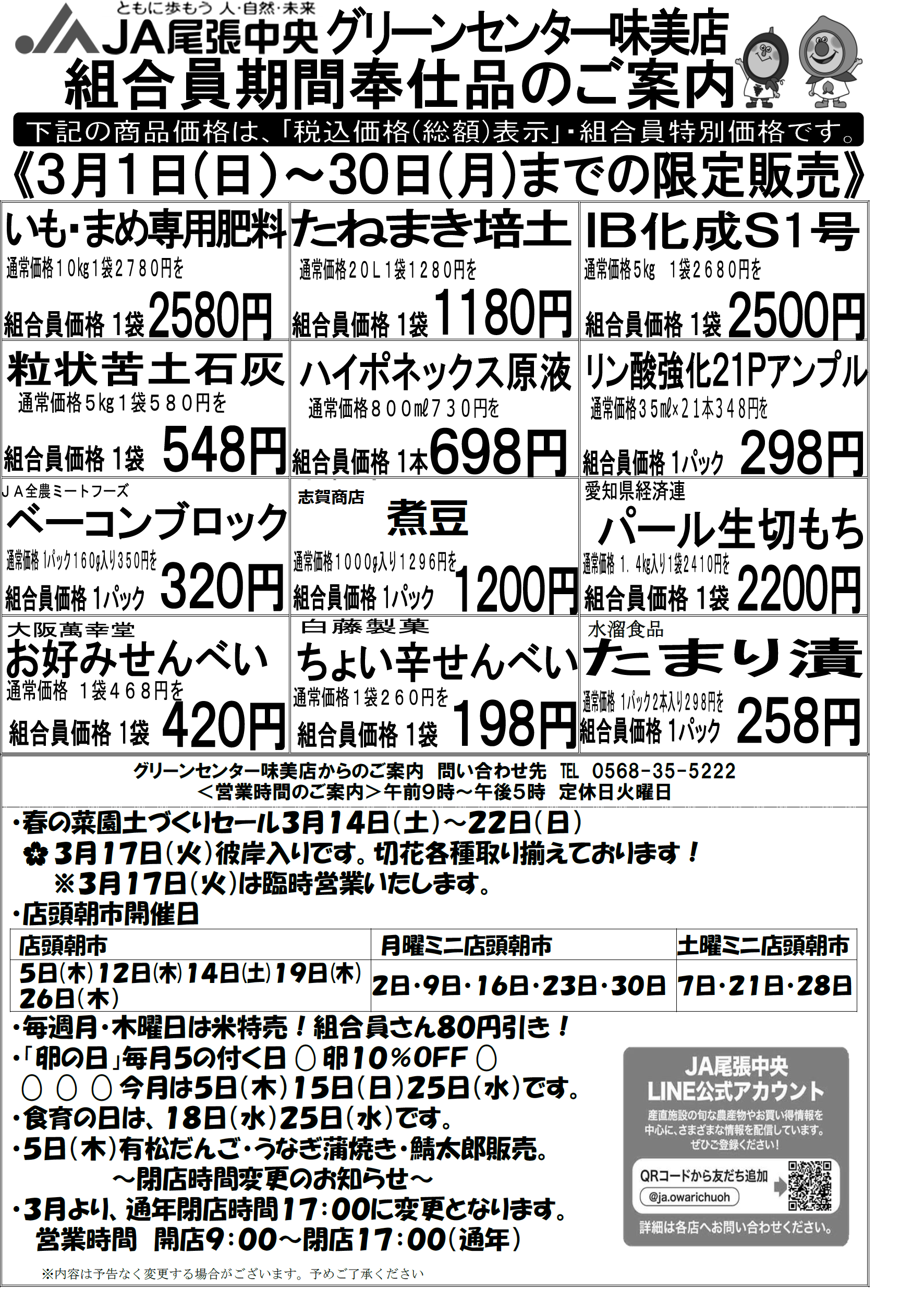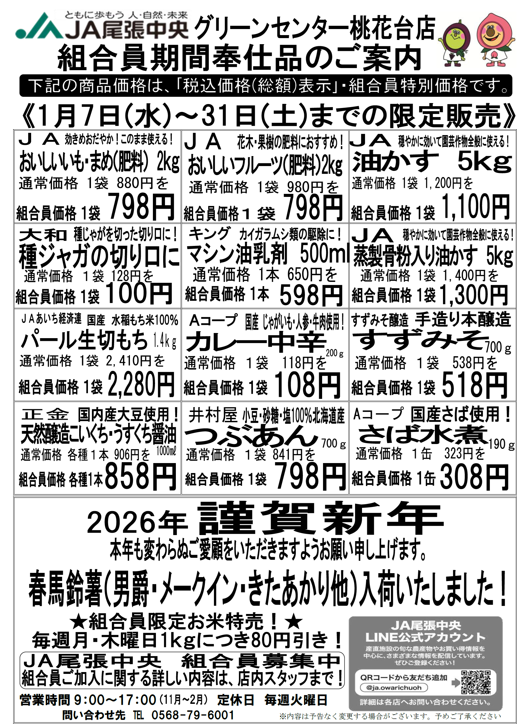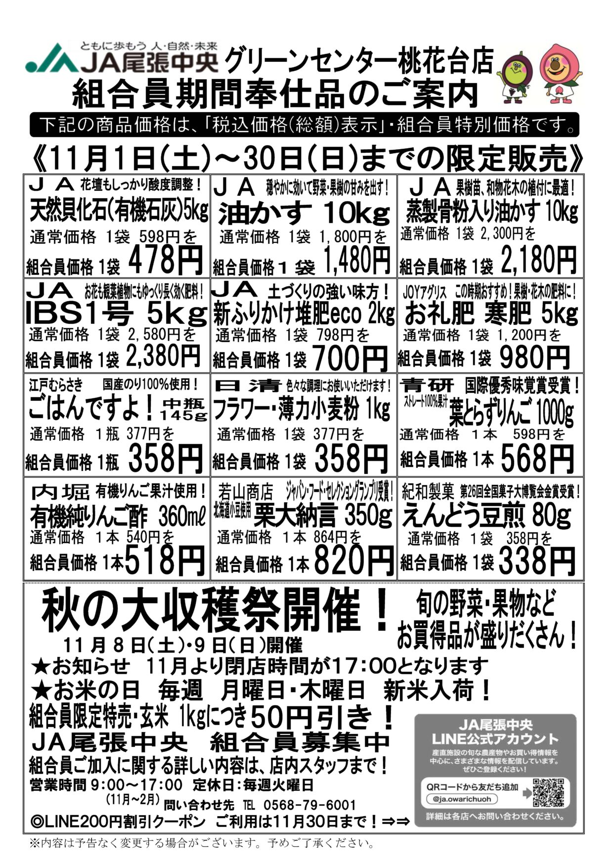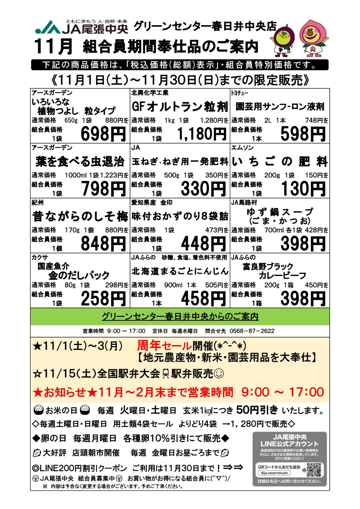各産直施設では組合員の方限定で、一部の商品がお買い求めやすい値段となる「組合員特別奉仕品」の販売を行っております。
