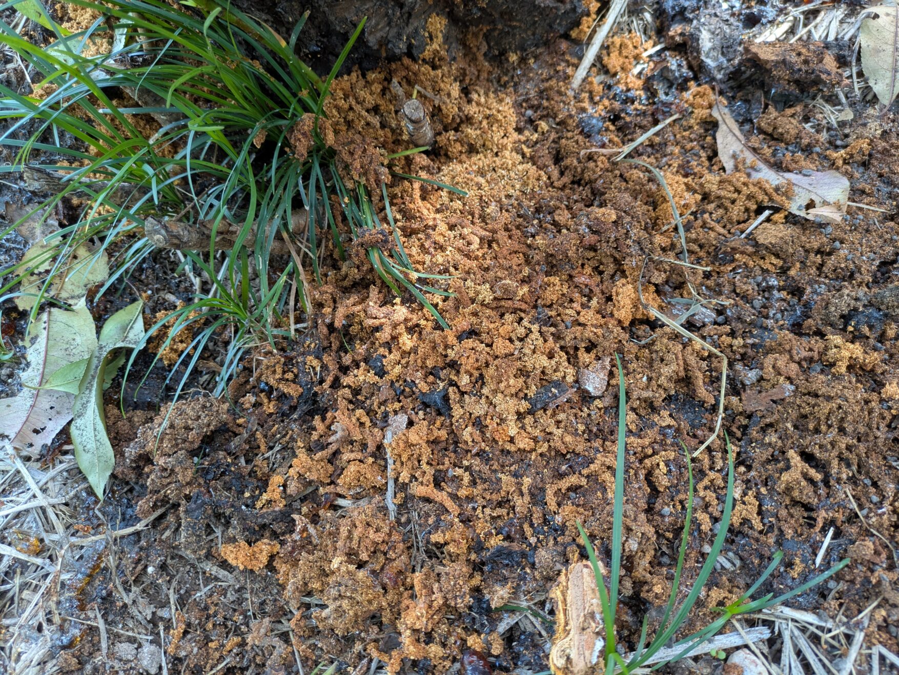 尾張農林事務所農業改良普及課と連携して、周辺の被害状況を確認し、フラスを取り除き食入孔に針金やドライバーを突き刺して幼虫を刺殺し、登録殺虫剤:ロビンフッドを噴霧します。