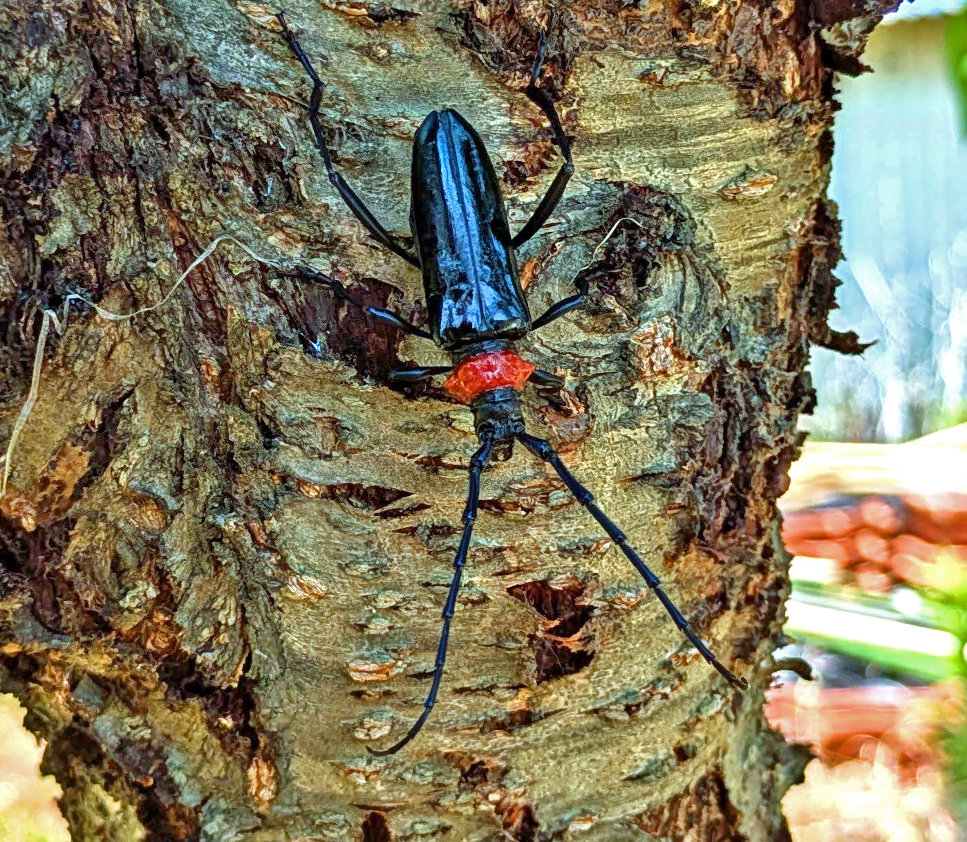 幸か不幸か、愛知県・果樹での「クビアカツヤカミキリ」発見・採集の第一号です。モモの株元に頭を下にして佇んでいました。クビ?が赤い?ので、すぐに分かりました。慣れたもので、ちゃんと写真を撮ってから、掴まえました。採集ビン(PET)に入れたら、高温のせいか、呆気なく★になられてしまいました。合掌です。1匹しか捕まらなかったということは、どこかから飛んできたのでしょうか。最近(R7年7月)では、管内近くでもちらほら見つかっています。