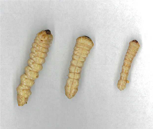 外来生物法による特定外来生物に指定され、飼育・移動・放出が禁止されています。その名のとおり、クビ(首)の部分(本当は前胸背板)がアカ(濃いオレンジ)で、他の部分がツヤツヤの黒です(写真①)。2012年に、外国から材木に隠れてやって来て、愛知県で初見され、徐々に生息域を広げています。成虫は個体差が大きく、体長20~40mmで、幼虫は白から象牙色の頭が大きいイモムシで、終齢は体長30~50㎜になります(写真②)。メスが樹皮に数百~1,000個くらい産卵し、幼虫が樹の木質部を食害しながら、推定1~3年で成虫になります。木部の食害が進むと樹が衰弱し、ひどいと枯れてしまいます。被害が拡大すると、産地存亡にも関わります。捕獲数に応じて報奨金(10匹500円くらい)を出している地域もあります。