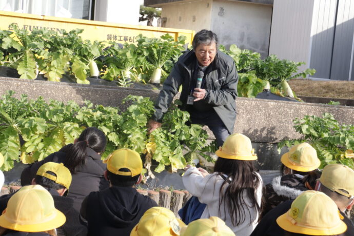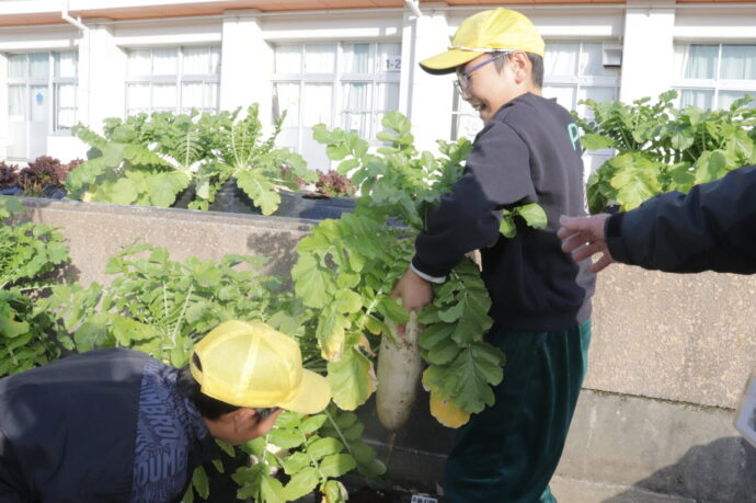 19日の収穫体験では、昨年10月初旬に児童自らが植え付け、大切に育ててきたダイコンを収穫。児童は磯部営農指導員から「折れないようにまっすぐ引き抜く」といったコツを教わり、大きく育ったダイコンを次々と収穫しました。