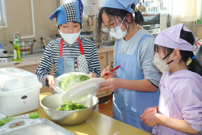26日には、総合学習「丸ごと大根チャレンジ!」と題した調理実習に挑戦。当日は、同校の教諭が朝に収穫したばかりの新鮮なダイコンを使用しました。児童は事前に自分たちで調べたレシピをもとに、保護者のサポートを受けながら、限られた85分の中で「大根の皮チップス」や「大根の葉の塩ナムル」など計8品を調理。普段は捨ててしまいがちな皮や葉も余すことなく使い、食材を大切に使い切る工夫や、自分たちで調理して食べる楽しさを学びました。