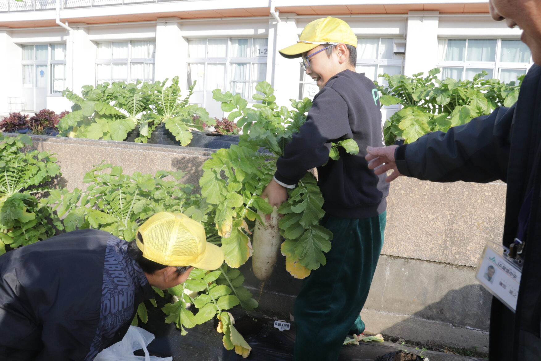 19日の収穫体験では、昨年10月初旬に児童自らが植え付け、大切に育ててきたダイコンを収穫。児童は磯部営農指導員から「折れないようにまっすぐ引き抜く」といったコツを教わり、大きく育ったダイコンを次々と収穫しました。