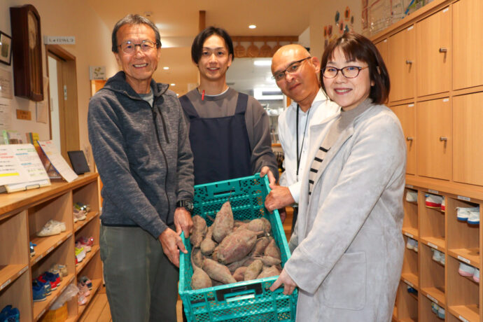 寄付したサツマイモは、先月に収穫した品種「紅はるか」。今年は大きさ・収量ともに例年以上の出来となり、委員と地域とのつながりを生かして、昨年に続いての寄付が実現しました。こども食堂ではカレーなどの料理に使用される予定で、保育園では食農教育や園児の料理体験に役立てられます。