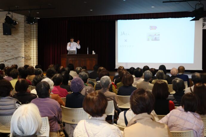 女性部(全地区)とフレッシュミズは20日、春日井市総合福祉センターで料理研究家のコウケンテツさんを招いた合同講演会を開きました。当日は部員や会員約200人が参加し、食を通じた家族のコミュニケーションについて学びました。