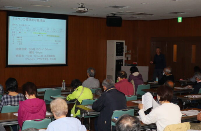 中山営農指導課長は挨拶で「講座で学んだ知識を活かし、最終的に産直出荷者になっていただければ大変嬉しいです。自分が育て、産直売場に並んだ野菜を見て消費者がどんな反応をするのか、また、作る喜び・売る喜び、それぞれの喜びを是非味わっていただきたい」と話しました。