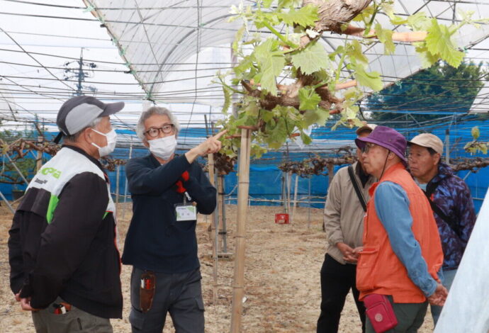 ▲ぶどうの枝管理について指導を行う営農技術指導員
