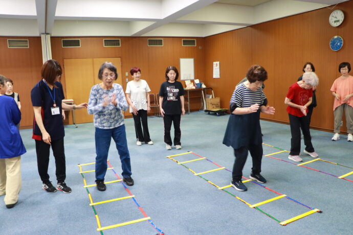 部員は色に合わせて歩き方の法則を変えるコグニラダーや、歩きながらしりとりや引き算をするコグニウォークなど3種類のエクササイズに挑戦しました。