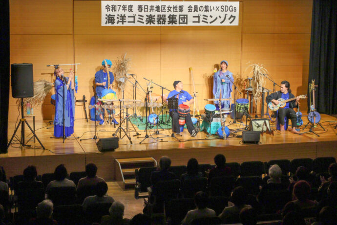春日井地区女性部は8日、文化フォーラム春日井で「会員の集い」を開き、部員71名が参加しました。今回は、海洋ゴミ楽器集団「ゴミンゾク」を招き、漂流物から作られた楽器によるSDGsコンサートを楽しみました。