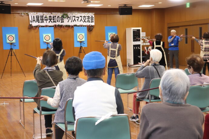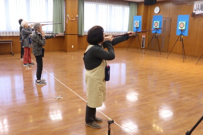 今回は日本スポーツウエルネス吹矢協会から指導員の方々を招き、「スポーツ吹き矢」に挑戦。腹式呼吸を使うスポーツ吹き矢は、精神集中や血行促進、細胞の活性化など健康増進に役立つと言われています。参加者は5~10m離れた円形の的をめがけて矢を放ち、得点を競い合いました。