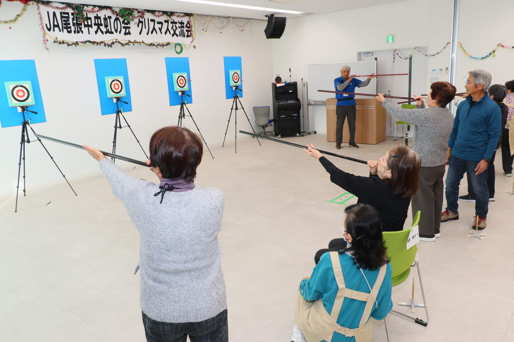 今回は日本スポーツウエルネス吹矢協会から指導員の方々を招き、「スポーツ吹き矢」に挑戦。腹式呼吸を使うスポーツ吹き矢は、精神集中や血行促進、細胞の活性化など健康増進に役立つと言われています。参加者は5~10m離れた円形の的をめがけて矢を放ち、得点を競い合いました。