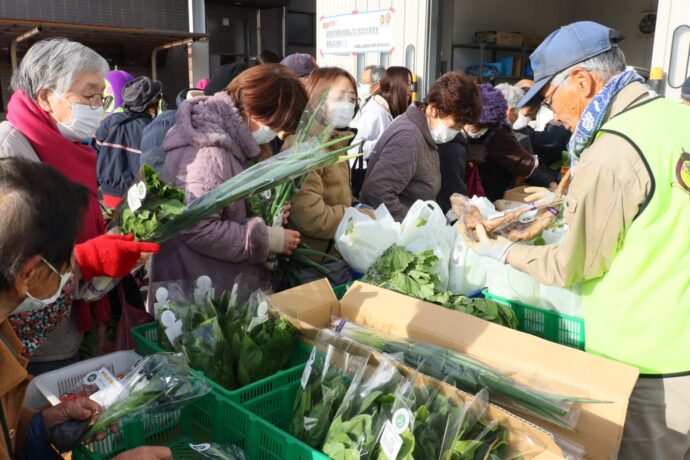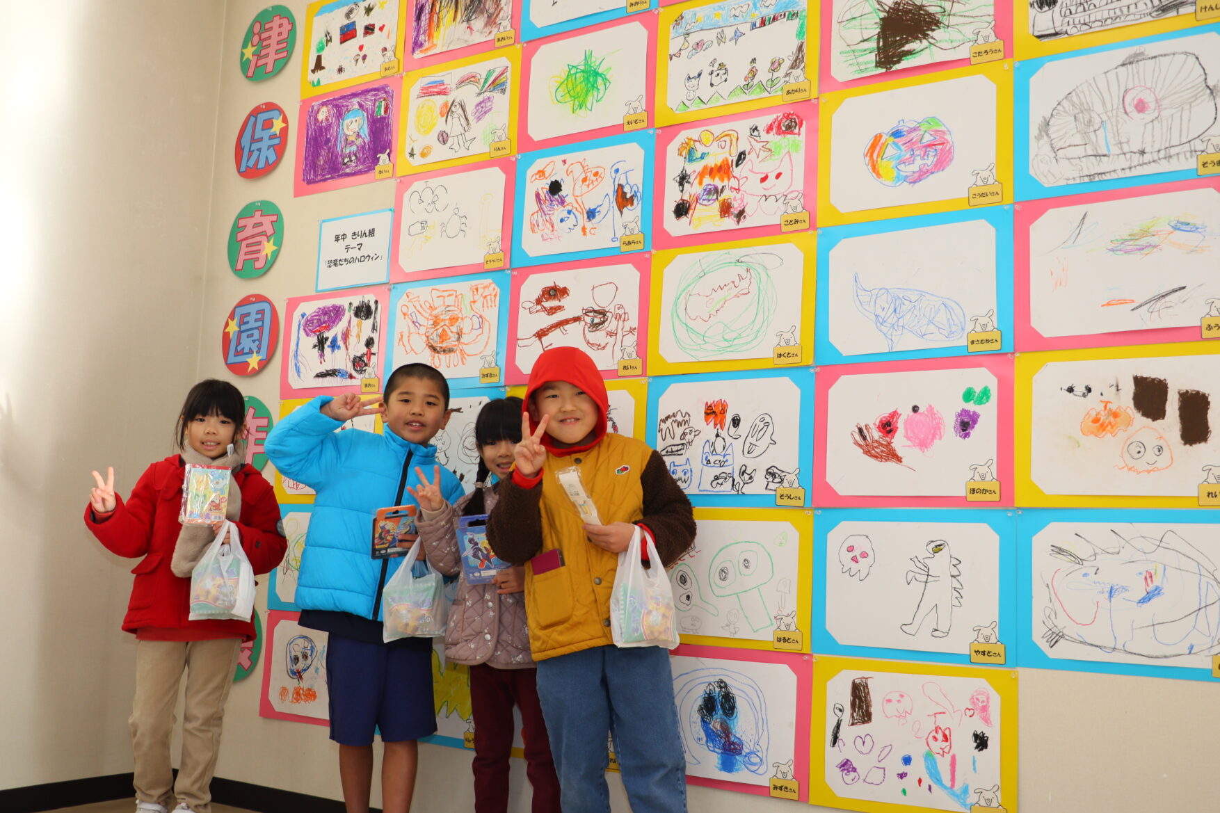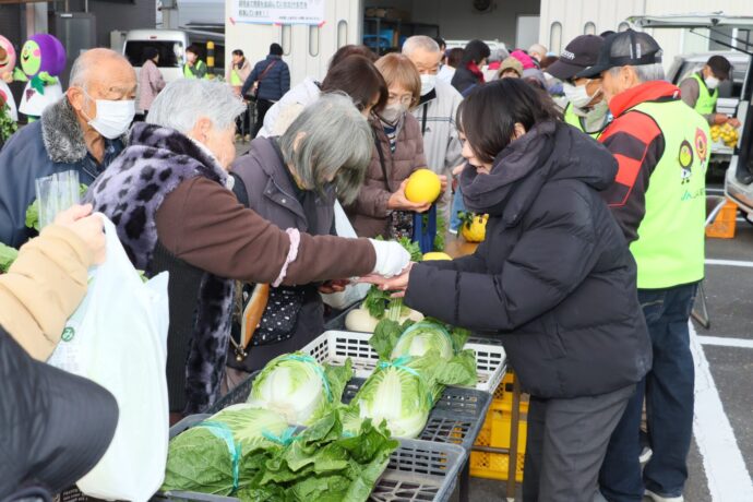 会場入口では、来場者への先着プレゼントとしてダイコンを配布。ふれあい委員や地元生産者が持ち寄った新鮮な農産物の即売会が行われ、旬の味覚を買い求めて多くの利用者が訪れました。また、店内では、同支店管内の下津保育園による作品展示会も実施。来場した子どもたちにはお菓子がプレゼントされ、親子連れなどが園児たちの作品を楽しみました。