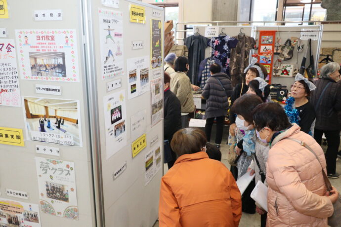 また特設コーナーには、「手芸教室」のリメイク服や「ニットクラブ」の編み物、「桃の会」の絵手紙などが展示され、来場者の目を楽しませました。