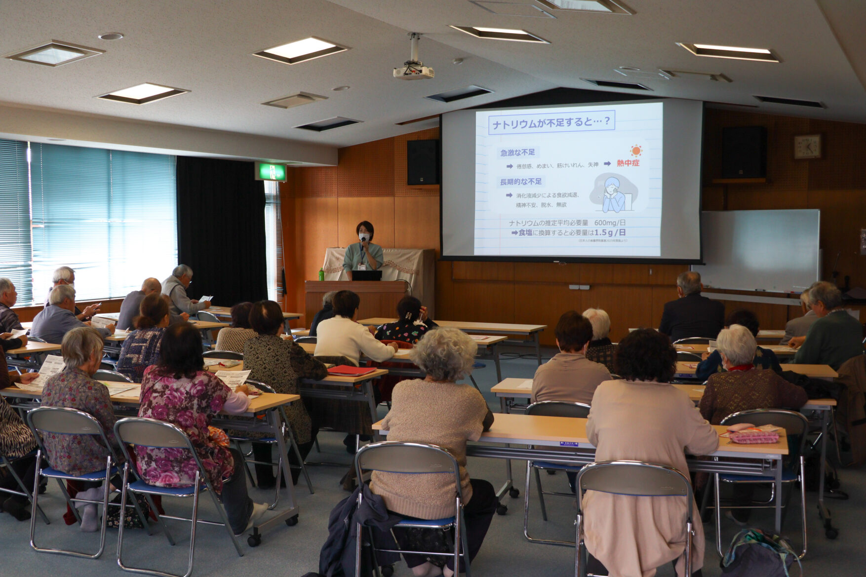 この健康講話会は健康維持・増進を目的に地域住民と協力して毎年開かれており、今回は「さらば減塩~気軽に摘塩快適生活~」と題し、塩が体にもたらす影響や、塩分チェックシートを用いた食生活の改善などについて学びました。