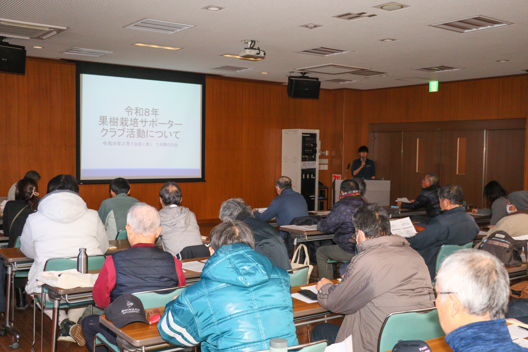 果樹栽培サポータークラブは2月19日、本店3階大会議室で「令和8年果樹栽培サポータークラブ説明会」を開き、クラブ員43名が出席しました。今年から、13年間親しまれた「モモ栽培サポータークラブ」の名称を変更。モモ栽培で培った技術を活かし、ブドウ農家への援農にも本格的に力を入れていきます。