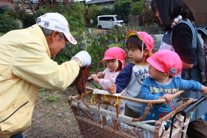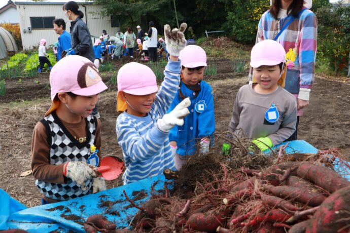 坂下北保育園の園児との収穫体験では、年少、年中、年長の園児が参加。手袋をつけた園児は小さな手で、一生懸命土を掘り、サツマイモを収穫しました。