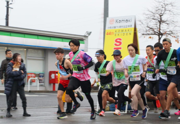 開会式で山下史守朗小牧市長は「市制70周年という記念すべき年に、多くのランナーが集い、タスキをつなぐ光景は大変喜ばしいです」と挨拶。スタートの号砲を務めました。