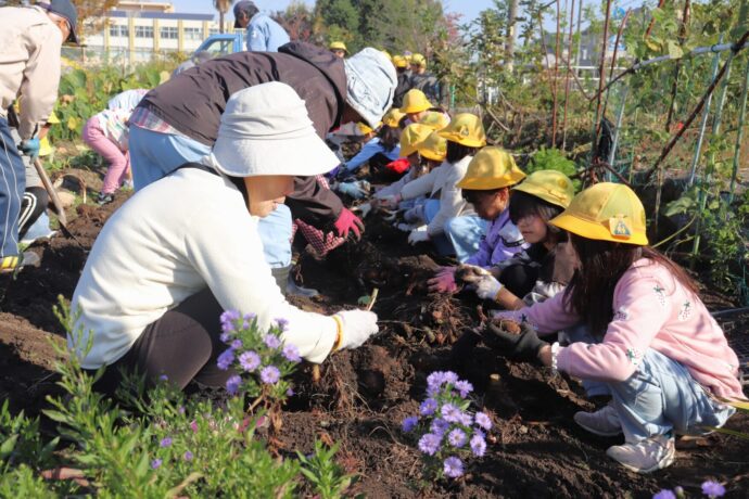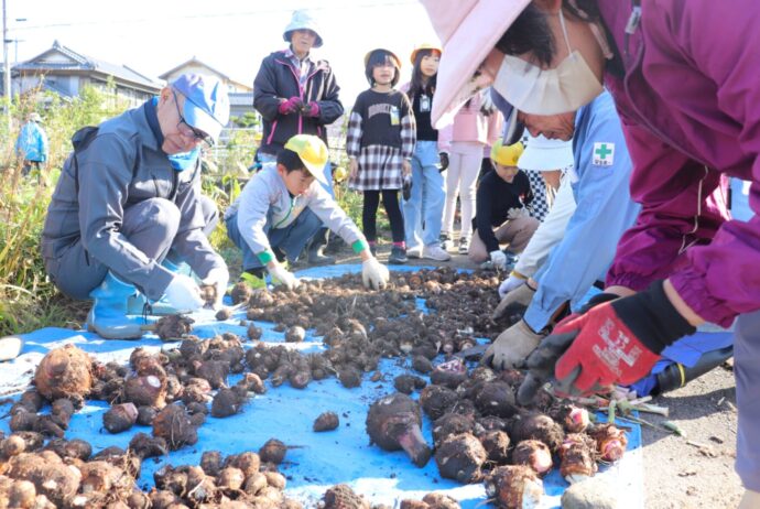 小牧市立小木小学校は14日、北里支店小木地区ふれあい委員会協力のもと、サトイモの収穫体験を行い、3年生児童や同委員、職員など計66名が参加しました。