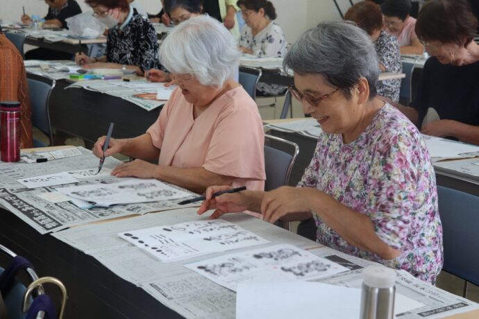 「己書」とは書き方や文字の書き順にとらわれることなく、心のままに文字や絵を表現する新しい書道のスタイルです。講師に春日井市で「雅登道場」を開く鈴木雅登師範を招き、文字の書き方や絵の描き方などを教わりました。