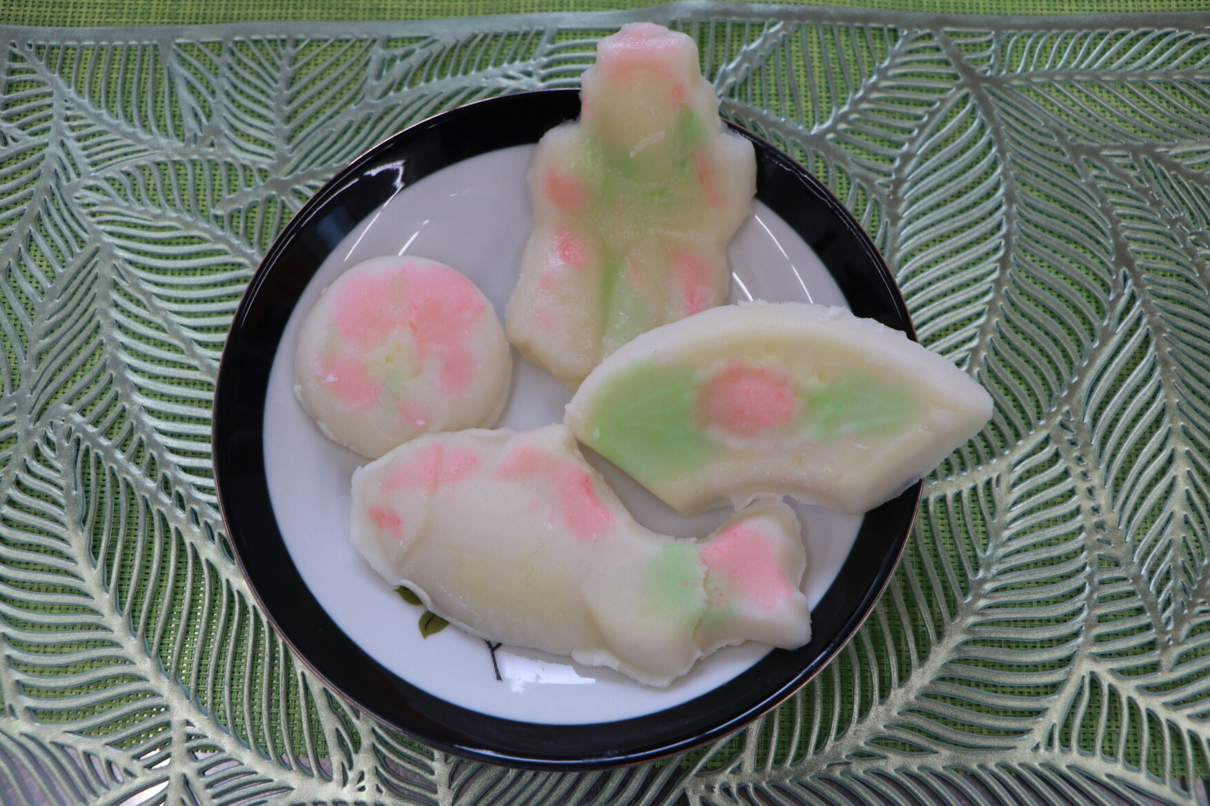おこしものは桃の節句のお雛様に供えられる愛知県の郷土菓子で、米粉ともち米粉を混ぜ合わせ生地が硬くなるまでこね、梅や鯛、お雛様などの型に入れ、食紅で色をつけて蒸したら完成です。
