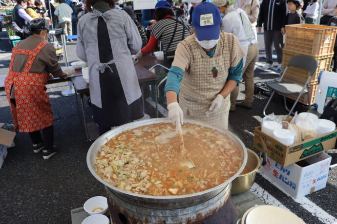 柿部会による店頭販売、もち米の枡売り、トラック市、朝市などが出店し、会場を盛り上げました。その他にも、産直部会員による豚汁の振る舞いは、開始時間前から長蛇の列が並び、多くの来店客が産直部会員お手製の豚汁を楽しみました。
