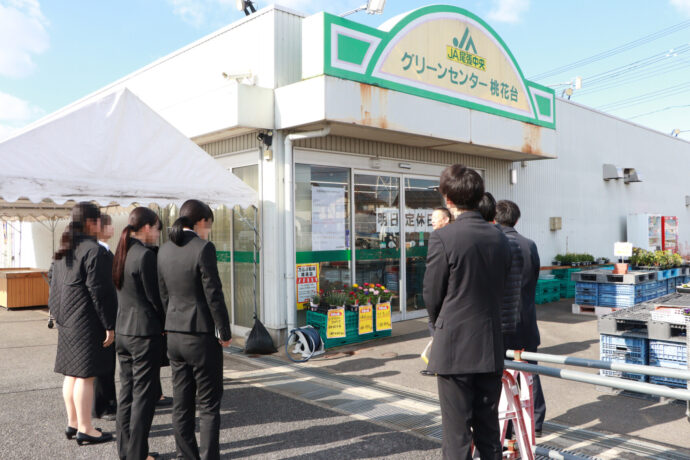 学生は、JAの組織体系や事業内容について学んだあと、本店営業課やグリーンセンター桃花台店を見学し、現場の職員から実際の業務内容について説明を受けました。また、各部署の若手職員が、JAを志望した理由や実際に働いてみた感想などを話し、最後は座談会形式で学生の質問などに答えました。
