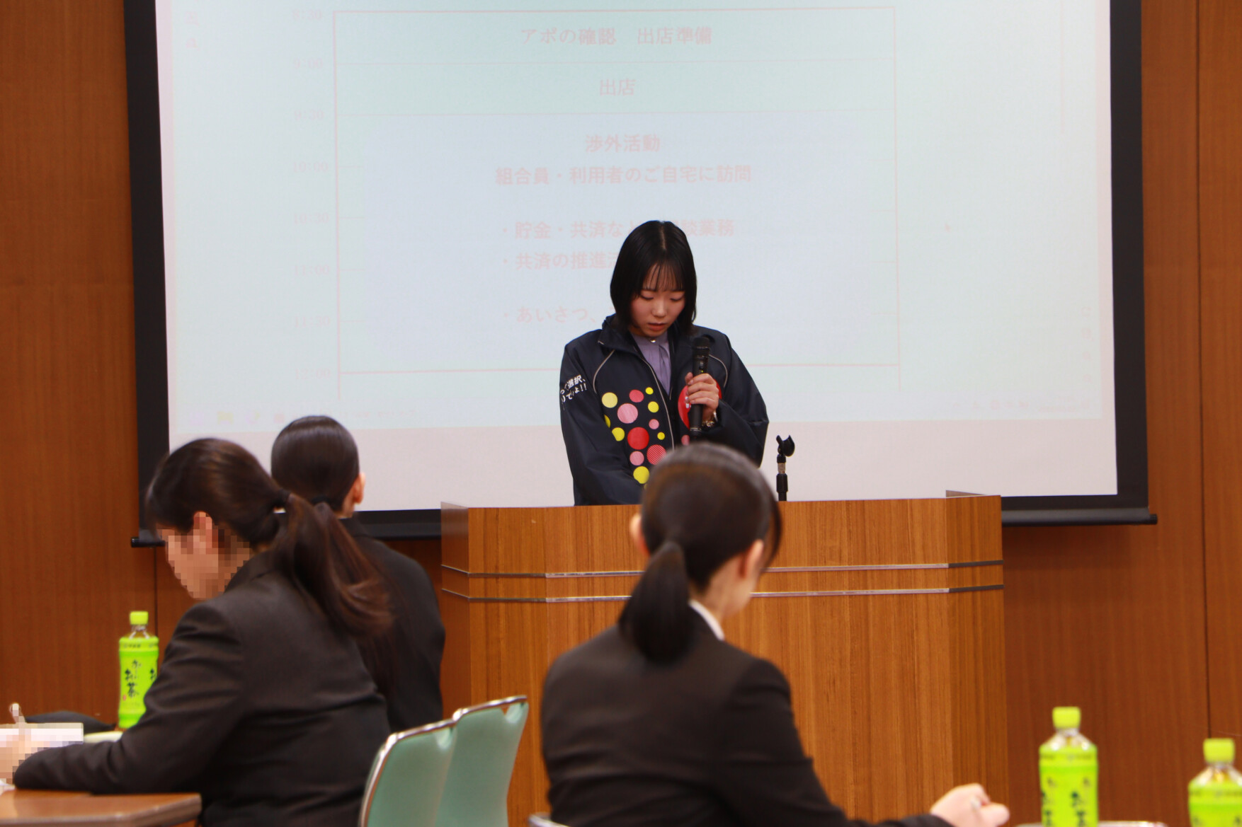 学生は、JAの組織体系や事業内容について学んだあと、本店営業課やグリーンセンター桃花台店を見学し、現場の職員から実際の業務内容について説明を受けました。また、各部署の若手職員が、JAを志望した理由や実際に働いてみた感想などを話し、最後は座談会形式で学生の質問などに答えました。