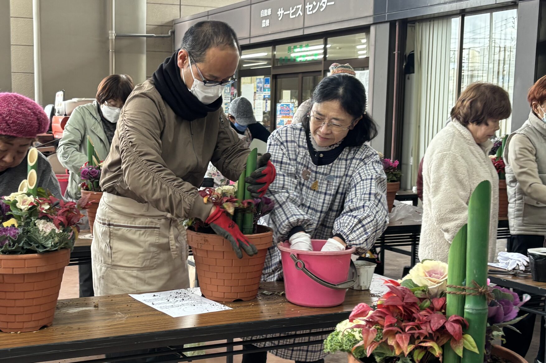 参加者は「仕事を頑張っている娘にプレゼントするために参加しました。華やかな気分で正月を迎えてほしいです」と笑顔で話し、思い思いに寄せ植えを仕上げていきました。