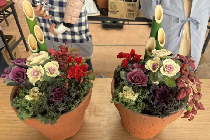 花材には、愛知で親しまれるちりめん葉牡丹やシクラメン、竹などが使われ、参加者は門松風の寄せ植えづくりを楽しみました。