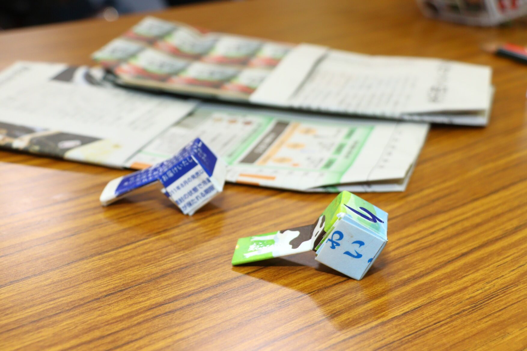SDGsを意識し、再利用可能な資源が用意された今回の講座では、牛乳パックを用いた防災笛と新聞紙を用いた緊急用の紙スリッパづくりに挑戦。支部長の大野さんが講師を務めたほか、事前に練習をした部員がサポートに回り、部員たちは約1時間ほどかけて制作していきました。