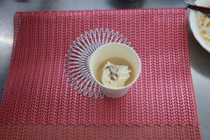 今回、部員は「ほうじ茶ミルクティーゼリー」と「黒蜜きなこをかけた白玉だんご」の計2品を作りました。白玉作りでは、混ぜ合わせる程に生地が重くなるため、部員は「腕が疲れてきたけど美味しいデザートのため頑張ります」と話し、部員同士協力しながら完成させました。完成後は、温かいお茶と楽しい会話をお供に、みんなでティータイムを楽しみました。