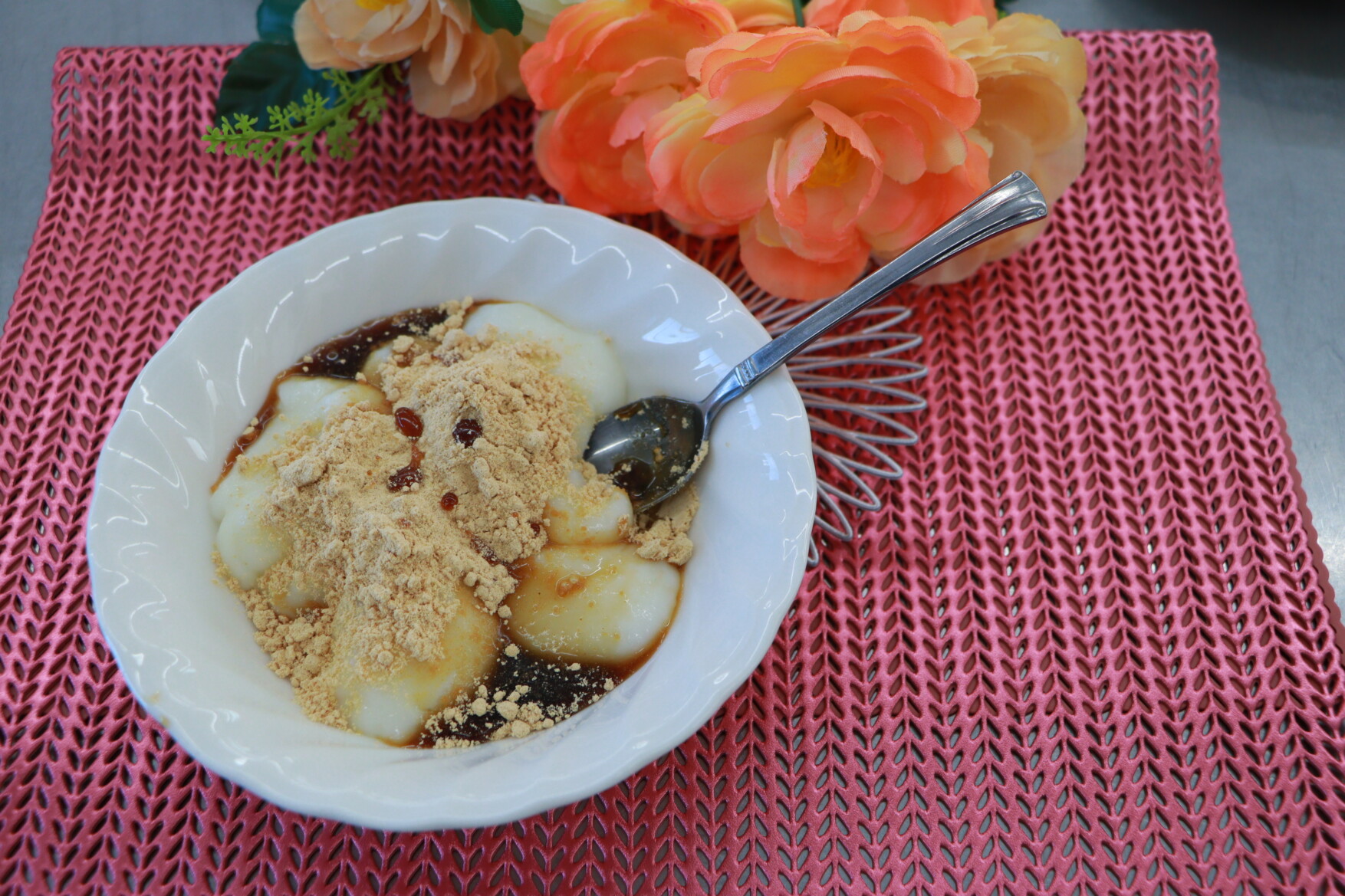 ▲黒蜜きなこをかけた白玉だんご(左)とほうじ茶ミルクティーゼリー(右)