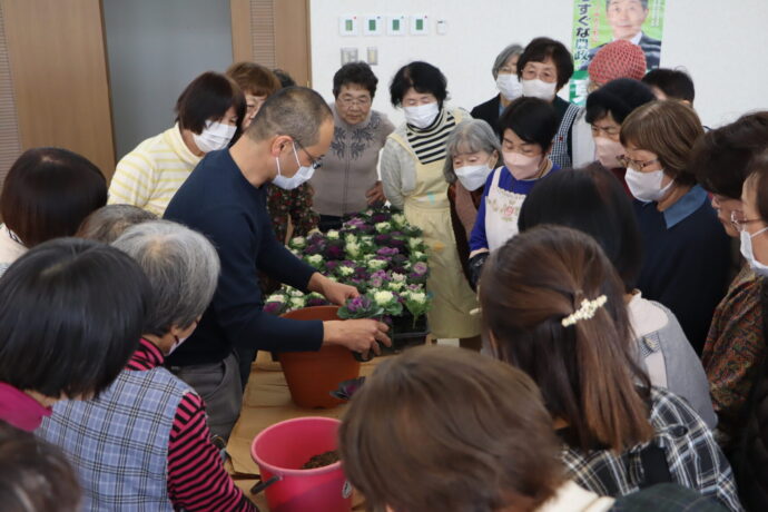 各地区で開かれたこの教室は、園芸を通じた地域住民の交流と、新年を彩る花々を楽しんでもらうことを目的に毎年開催されている恒例の取組みです。会場には、ハボタンやガーデンシクラメン、パンジーなど、冬の寒さに強く正月の装いにもふさわしい苗が用意されました。