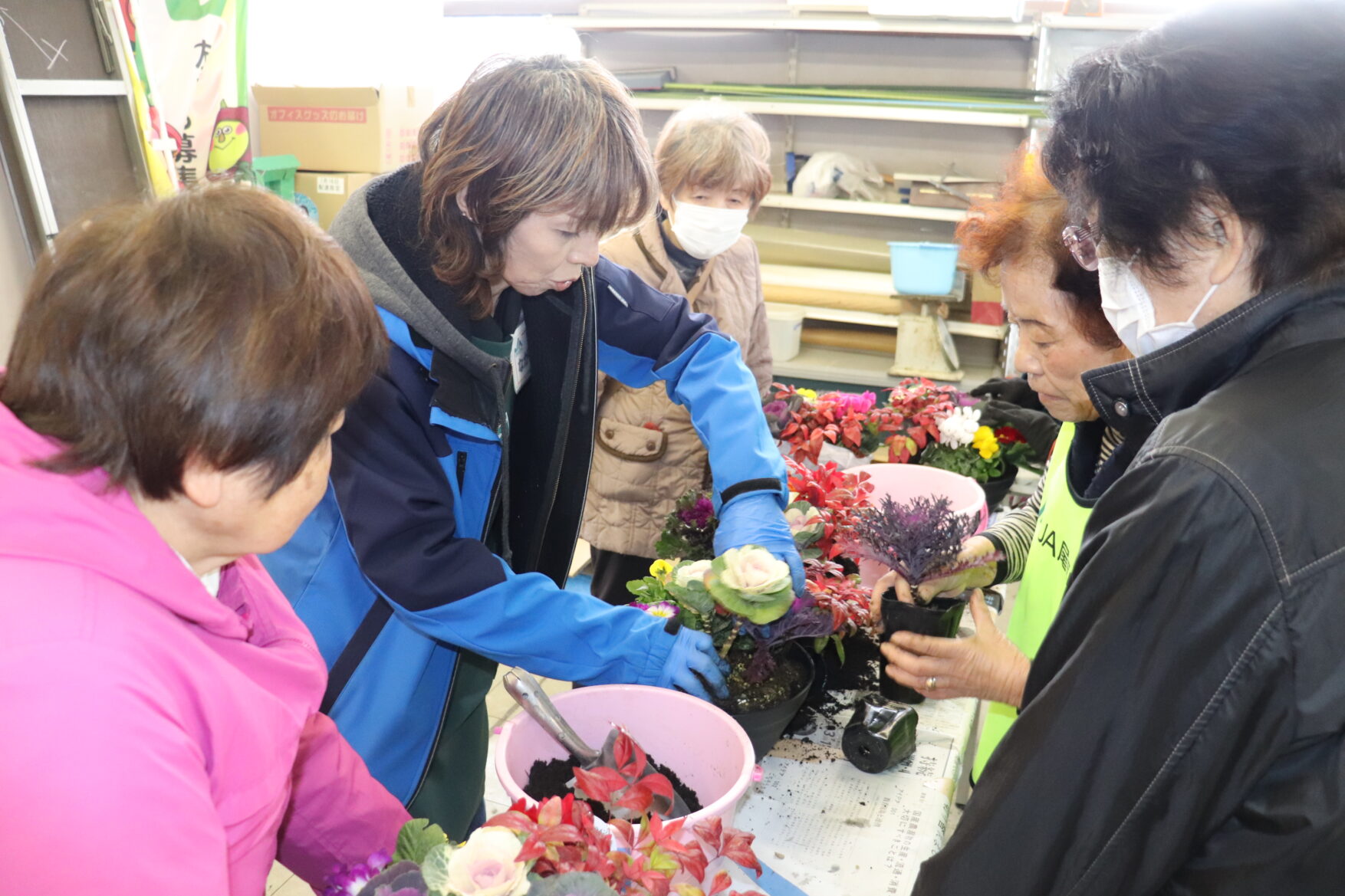 各会場では、グリーンアドバイザーの伊藤良樹さんやグリーンセンター職員、女性部部員やふれあい委員らが講師を担当。苗の配置や手入れのコツを学んだ参加者は、一株ずつ丁寧に鉢へ植え付けていきました。
