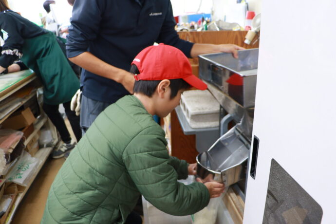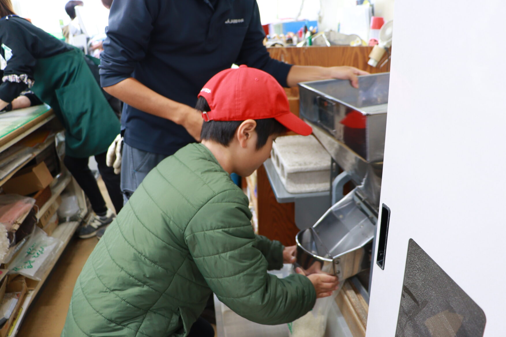 参加者は、収穫体験のほか、グリーンセンター桃花台店で精米体験を行い、あいちのかおりの玄米を精米し、持ち帰りました。最後はじゃんけん大会を行い、勝った2名には愛知県産コシヒカリが贈られました。