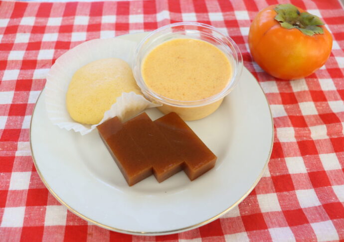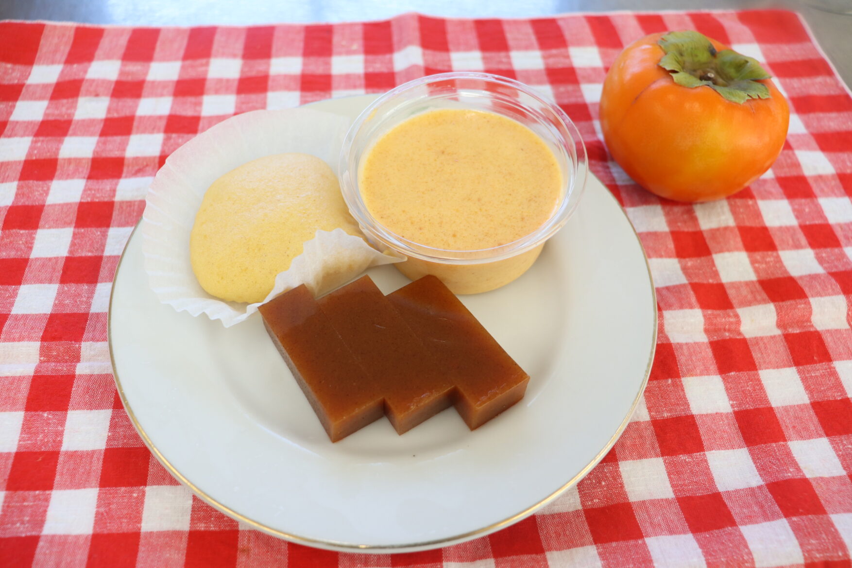 材料の柿は、部員の長谷川美子さんから提供された規格外のものを使用。柿ようかんの他に柿プリン作りにも挑戦しました。柿に含まれるペクチンが牛乳のカルシウムと合わさるとゲル化する性質を利用し、ゼラチンを使わずに作りました。また、冷蔵庫で冷やし固める時間を利用して、マーラーカオ(中華蒸しパン)作りも楽しみました。