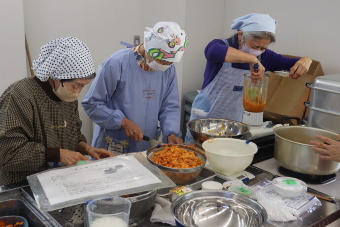高蔵寺地区女性部は11月26日、高蔵寺支店レインボーセンターで地元の柿を使用した柿ようかん作りを行い、部員40名が参加しました。