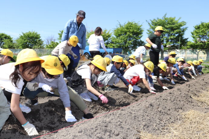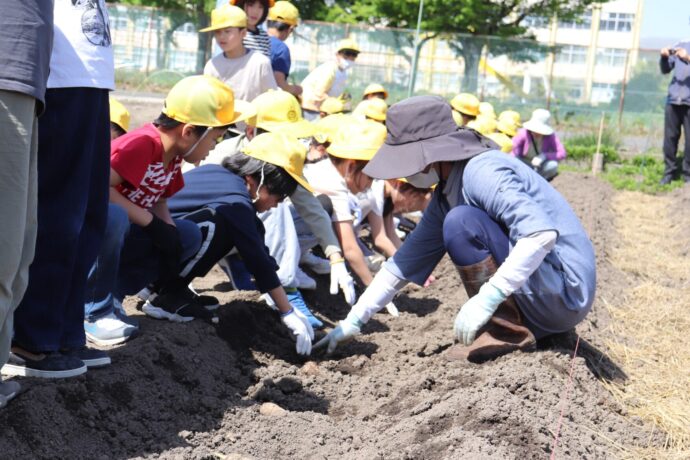 小牧市立小木小学校は25日、北里支店小木地区ふれあい委員会協力のもとサトイモの植え付け体験を行い、3年生児童48名が参加しました。